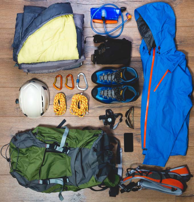- Down jackets, sleeping bags, trekking poles, boots, etc.